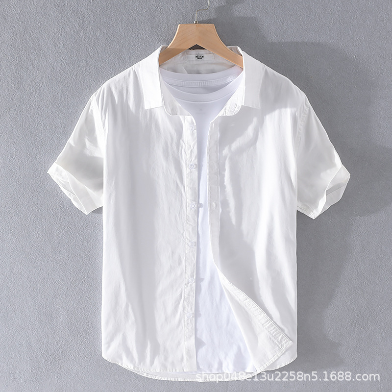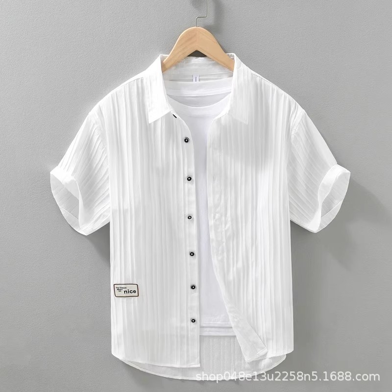 サマーシャツメンズ半袖薄手通気性アイスシルクノンアイロンプレスしわ質感カジュアルルーズカーディガン白シャツ