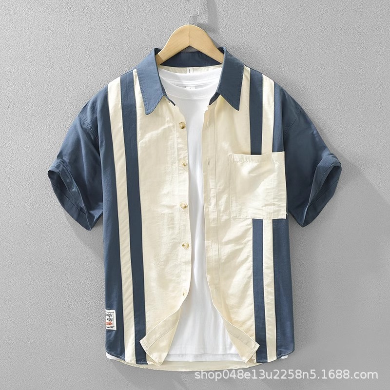 コントラストカラーステッチ無地半袖シャツメンズ夏日本のレトロトレンディブランドシャツアイスファッションルーズトップハンサム