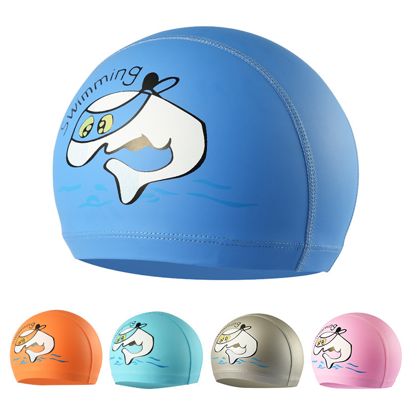 子供用pu水泳帽の布帽子は快適で、頭を絞めない男女子供通用アニメ専門のpuコーティング水泳帽卸売りです。