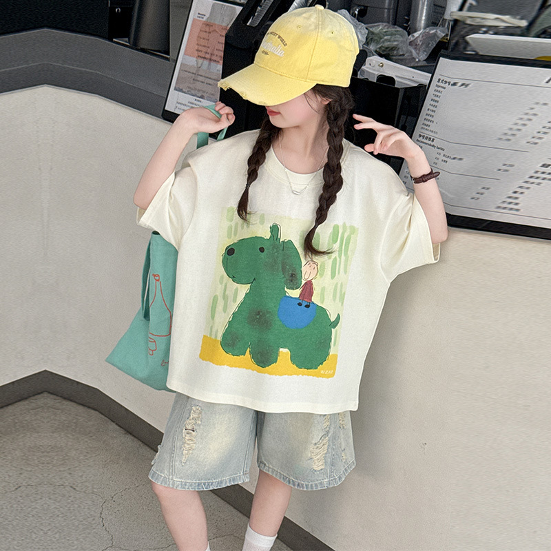 女の子サマースーツ 2025 新しいカジュアル漫画 Tシャツリッピングデニムミッドパンツ中大子供ツーピーストレンディセット