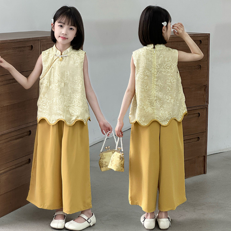女の子中国風スーツ夏 2025 新しいベビー新中国風薄いノースリーブトップワイドレッグパンツ夏唐スーツ