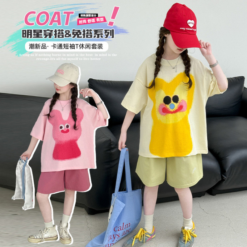 女の子サマースーツ 2025 新しい超見栄えの良い女の子レース漫画半袖ショーツ中大型子供夏ツーピースセット