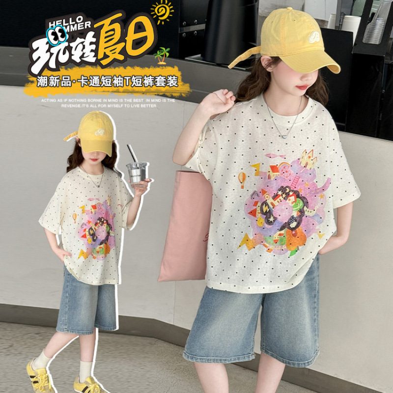女の子水玉プリントTシャツデニムミッドパンツスーツ2025年夏新作中大型子供用半袖ゆったり2点セット