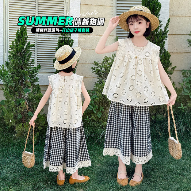 女の子中空レースベストセット 2025 夏韓国風子供ルーズベビードールチェック柄スカートツーピースセット