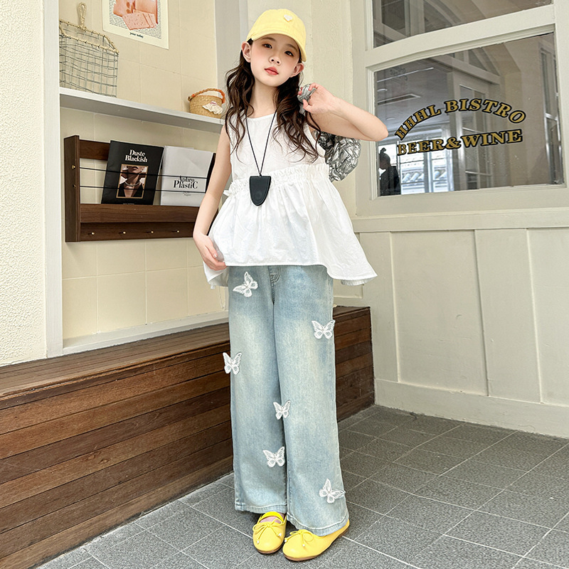 女の子の夏の洋気服2025の新型の中で大きい子供の白い上着の立体の蝶のジーパンの2セットのファッション