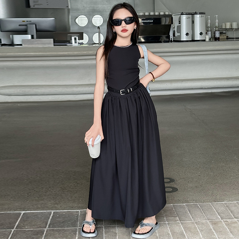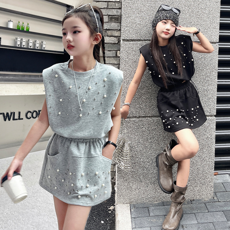 女の子の大きい子供の夏の半身のスカートのスーツの2025新型のビーズのノースリーブのベストのスカートの中で大きい子供の女の子の潮はクールです。