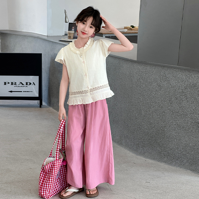 女の子の夏のレースの半袖セット2025新型子供の夏の修身のラッパのズボンの女の子の夏服の2つのセット