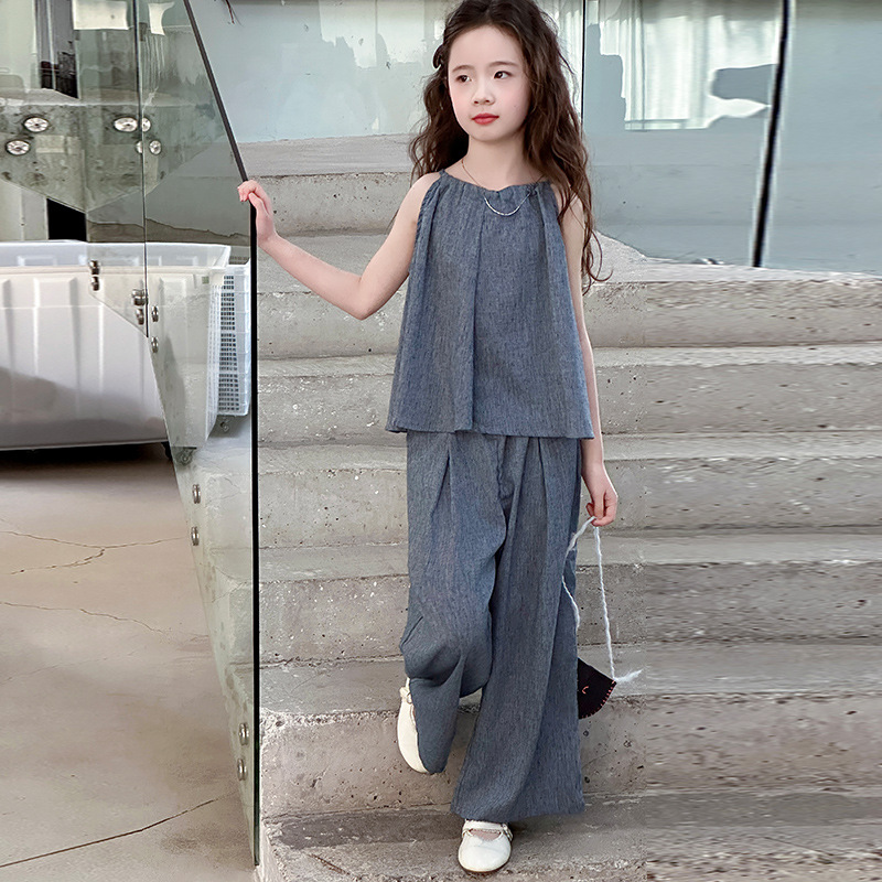 女の子用ストラップセット夏服2025新作夏女の子子供用洋風チョッキワイドパンツ2点セット潮