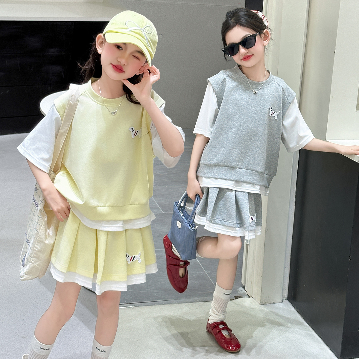 女の子のスーツのスカートの夏の2025新型の子供の洋風のレジャーの偽の2つのファッションの薄いタイプの半袖の2つのセットの潮