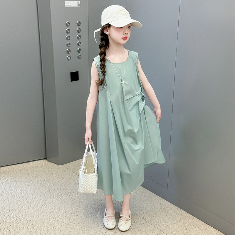 女の子の夏服のワンピース2025の新型の子供の洋気の流行の袖なしのベストのスカートの中で大きい子供のカジュアルな王女のスカート