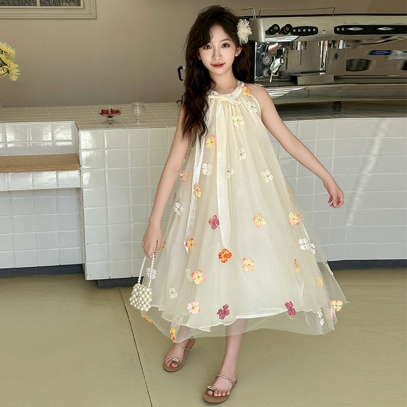 女の子の夏のワンピース2025の新しい女の子の洋気の花の花びらのガーゼのスカートの夏の袖なしの甘いビーチのスカート