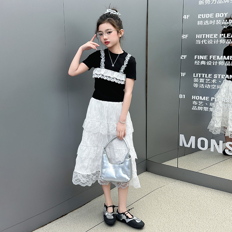 女の子のレースのスカートのスーツの2025の新しい洋気の子供の夏の半袖のレースは上着の半身のスカートの2つのセットをつなぎます。