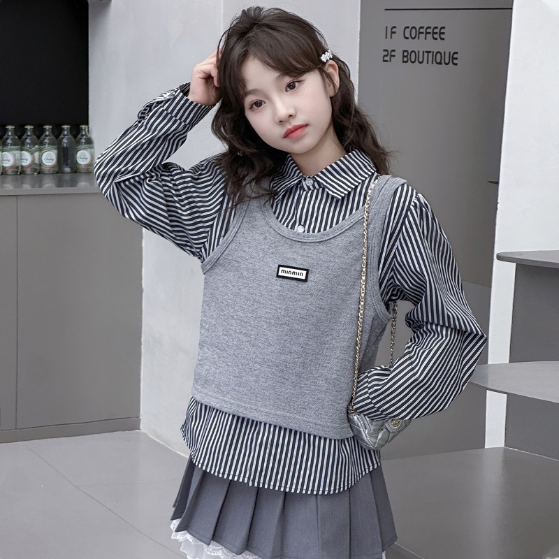 女の子の馬甲のストライプのシャツJKの百倍のスカートの学院の風の3つのセットの春秋2025の新型の長袖のシャツの洋風