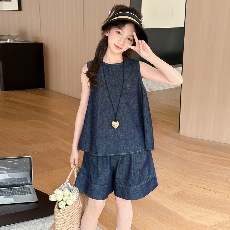 女の子の夏のノースリーブデニムスーツ2025新型の女の子の大きい子供の韓国版のベストの半ズボンの2つのセットの子供の夏服