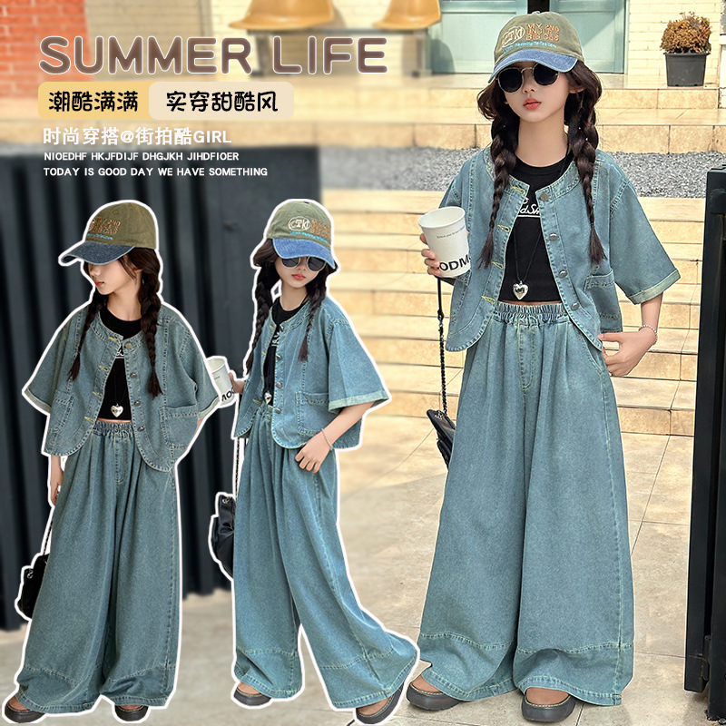女の子半袖カーディガンデニムセット2025夏新作女の子ゆるい上着ワイドパンツ2点セット韓国版