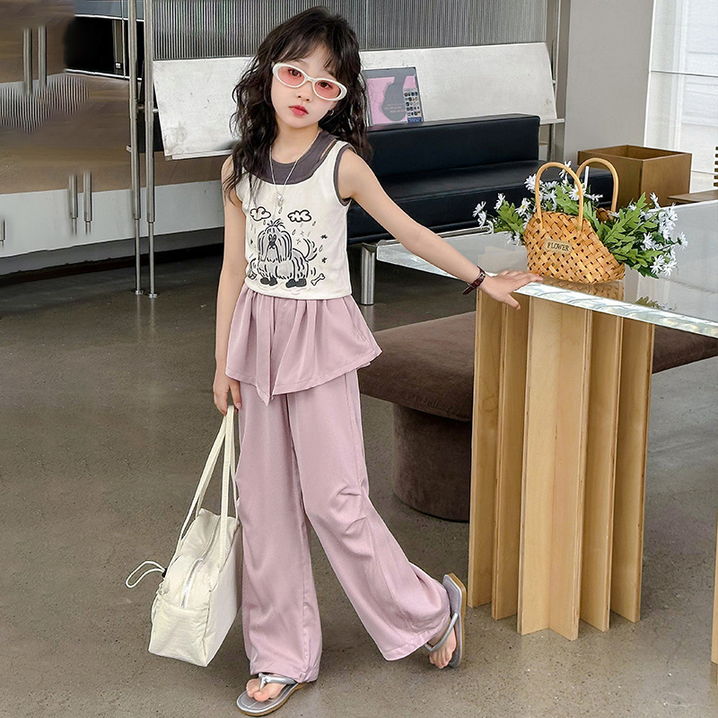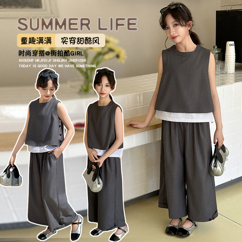 女の子の夏の韓国系のカジュアルなノースリーブのスーツ2025の新型の女の子の大きい子供の洋風のファッション的な夏のタイプの子供の夏服のファッション