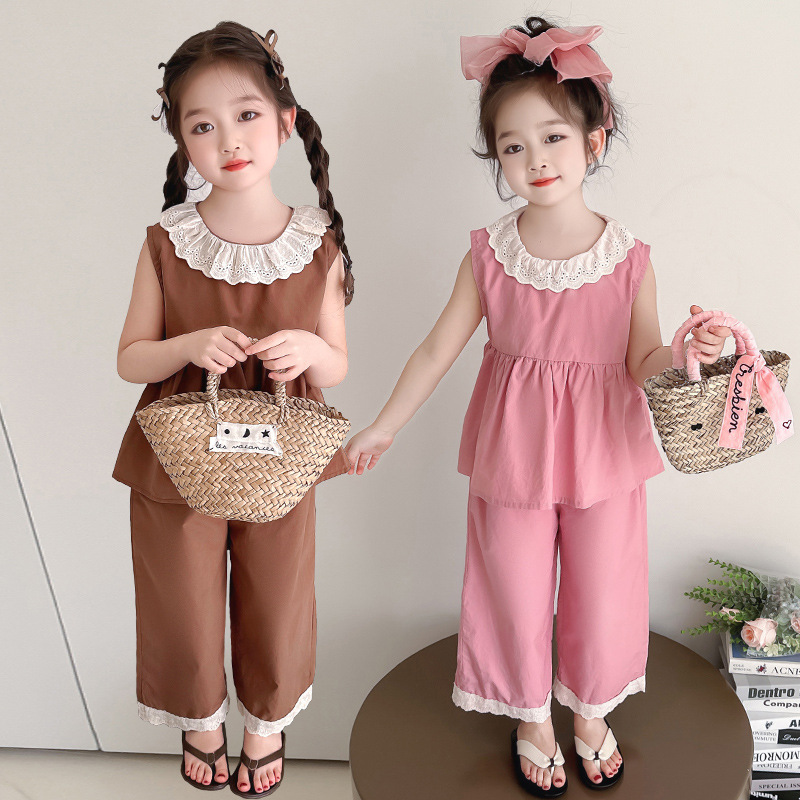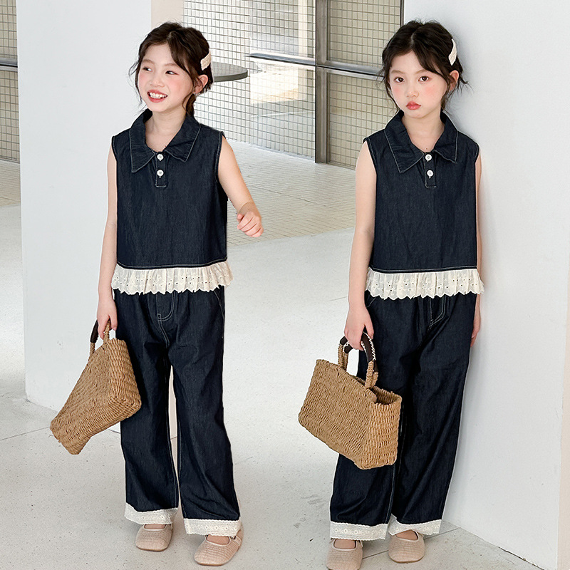 女の子ノースリーブデニム夏スーツ2025新型子供用レースベストワイドパンツ2点セット薄い