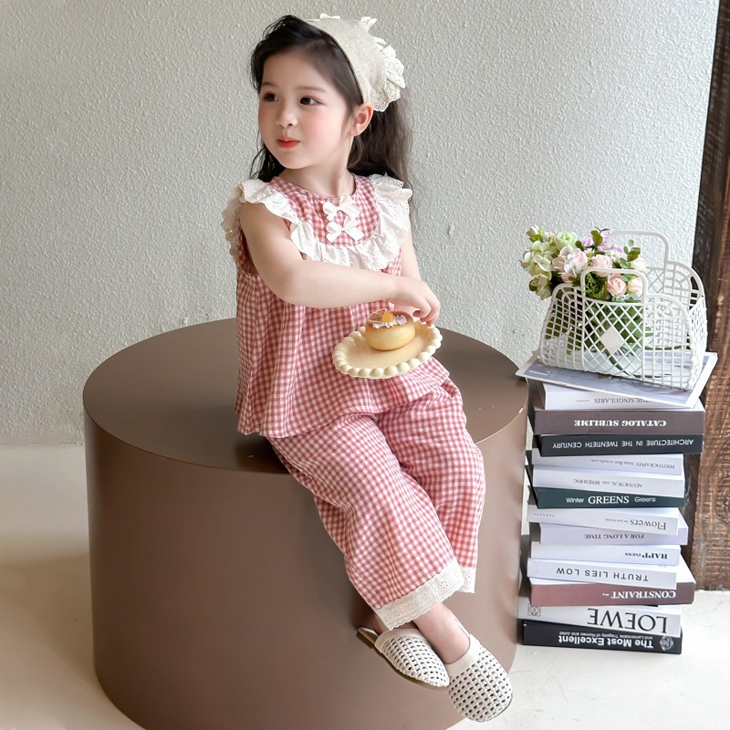 女性の子供の蝶結びの格子の袖なしのスーツの夏の2025新型の女性の赤ちゃんのレースの襟のベストの2つのセットのファッション