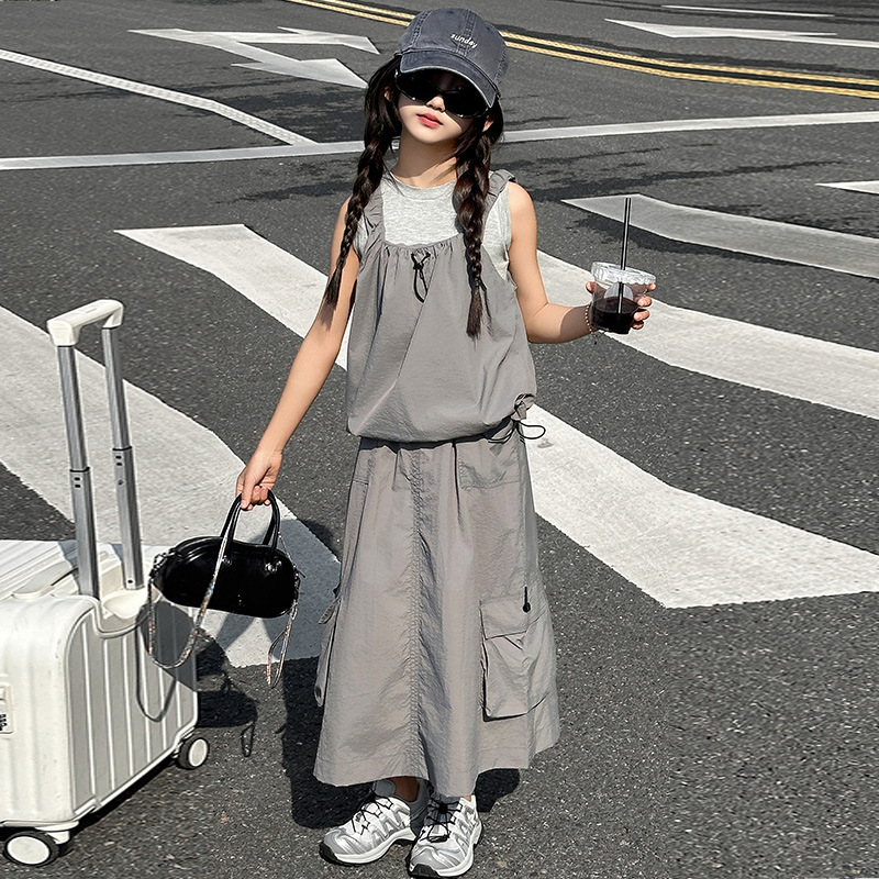 女の子の夏服セット2025新型子供の女の子の夏の洋風工装ベストスカート2点セットスカート