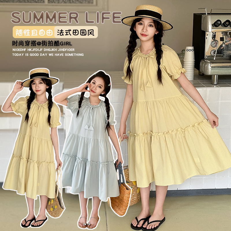 女の子の夏服のワンピース2025新型の洋風の子供の半袖の綿のスカートの夏の女性の大きい子供の学院の風のスカート