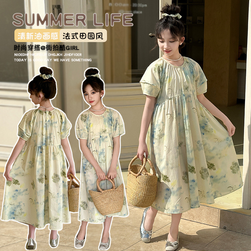 女の子の大きい子供のワンピースの夏の2025新型の女の子の洋気の半袖のスカートの中で大きい子供の夏の花のお姫様のスカート