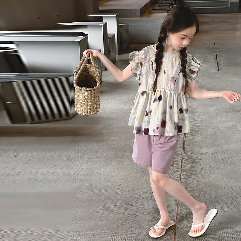 女の子の夏のスーツ2024の新しい子供の流行の洋風の夏服の中で大きい子供の飛袖のシャツの半ズボンの2つのセット