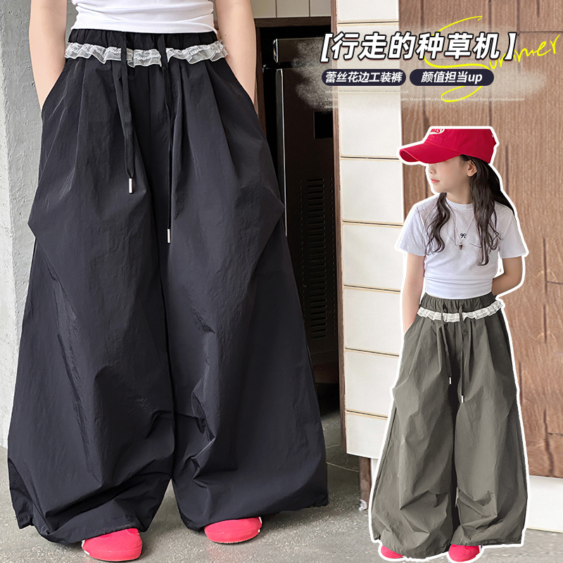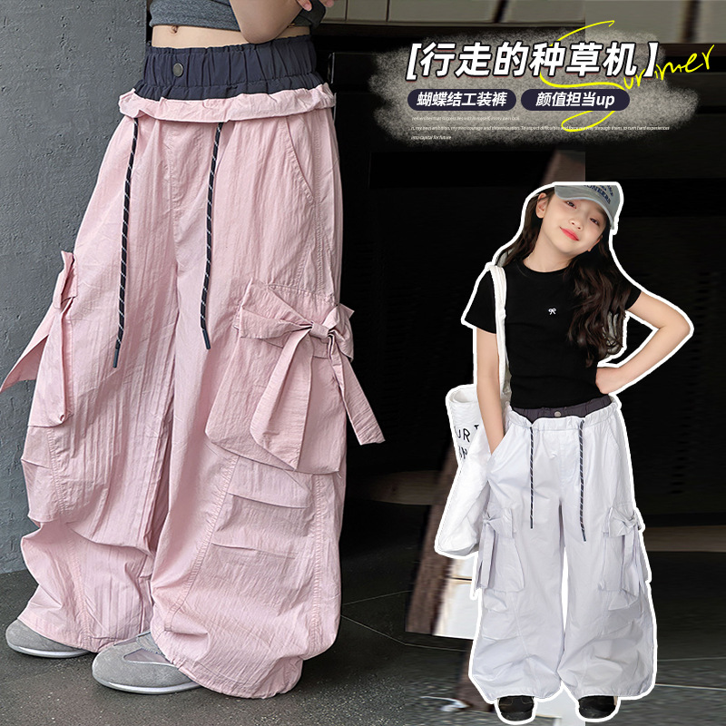 女の子のカジュアルな服装のズボンの春夏2025新型の中で大きい子供の洋気のズボンのファッション的な女の子の蝶結びのワイドパンツ