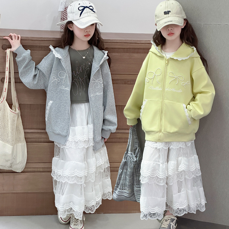 女の子の大きい子供のコートの春秋の金の2025新型の洋気の女の子の春の服装の韓国版のゆったりしている学生の帽子のカーディガン