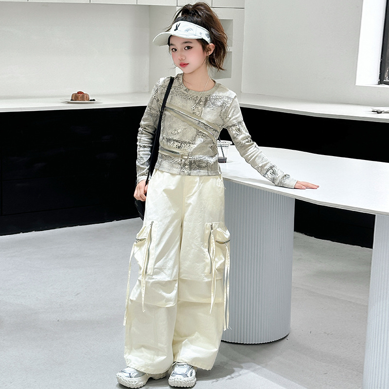 女の子セット2025春新作子供ファッションクール美式衛衣星迷彩工装ズボン春秋服2点セット