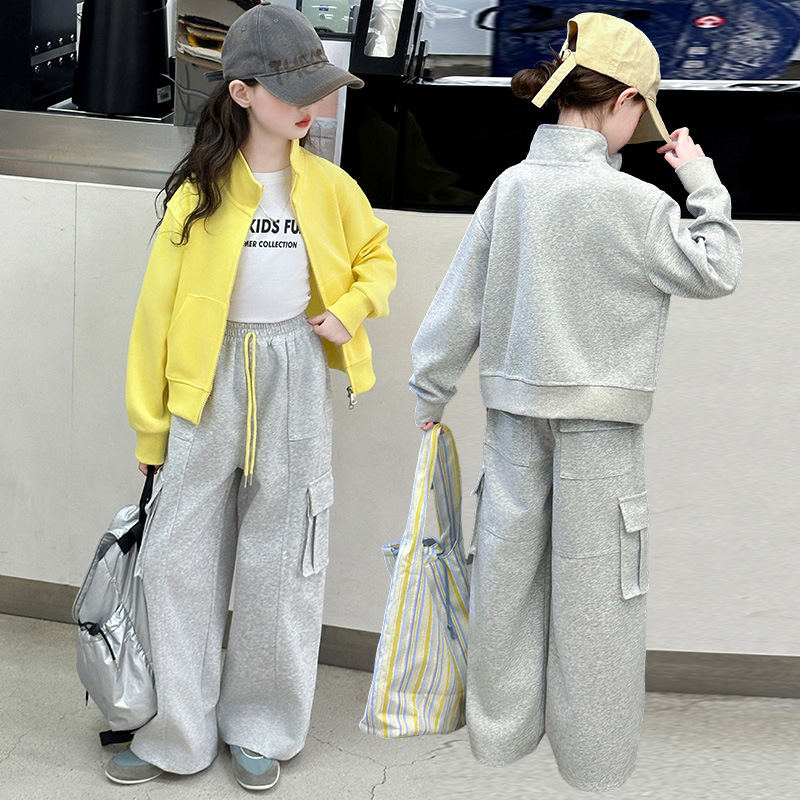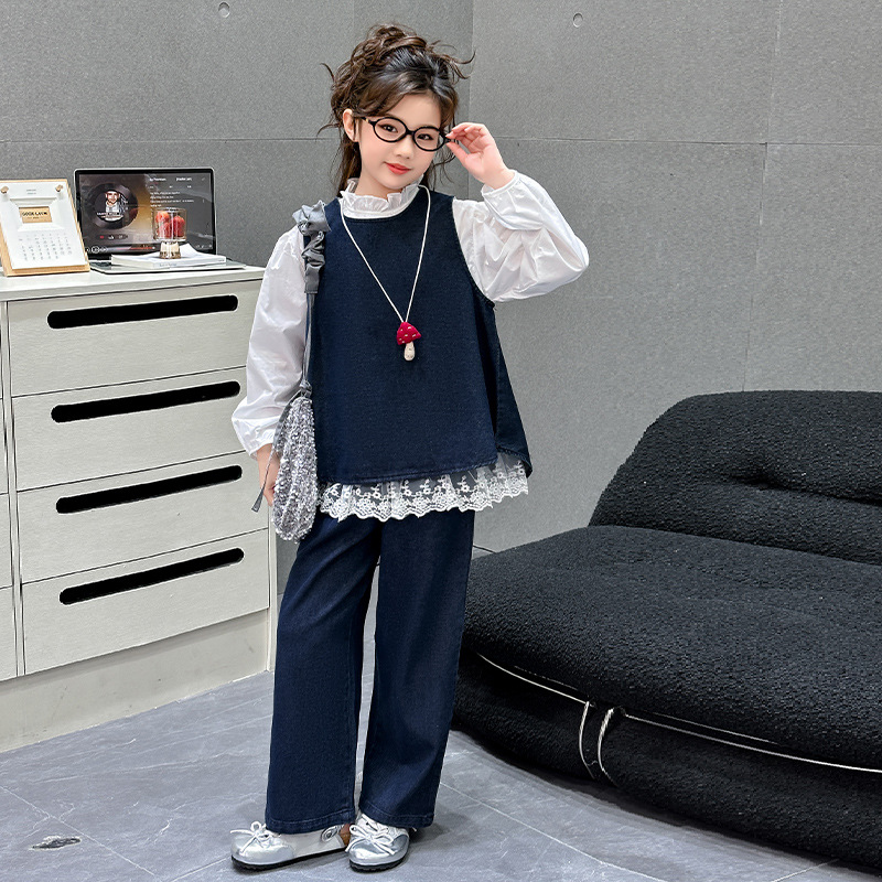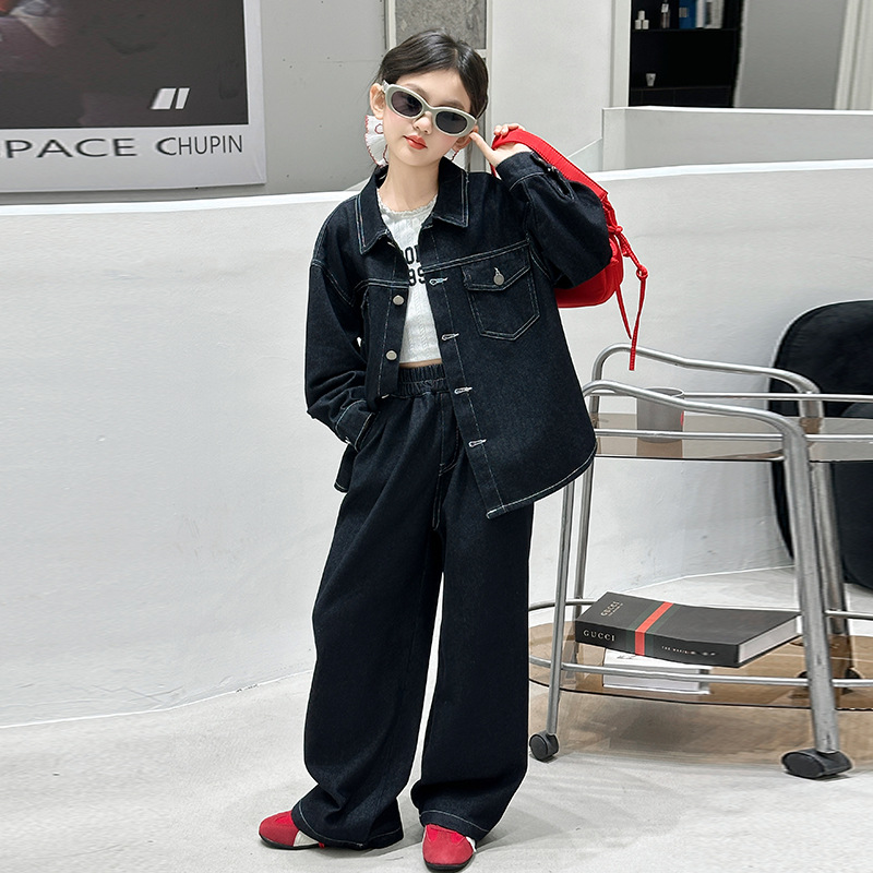 女の子春服カジュアルデニムスーツ2025春新作子供ファッション洋風女の子ワイドパンツ2点セット