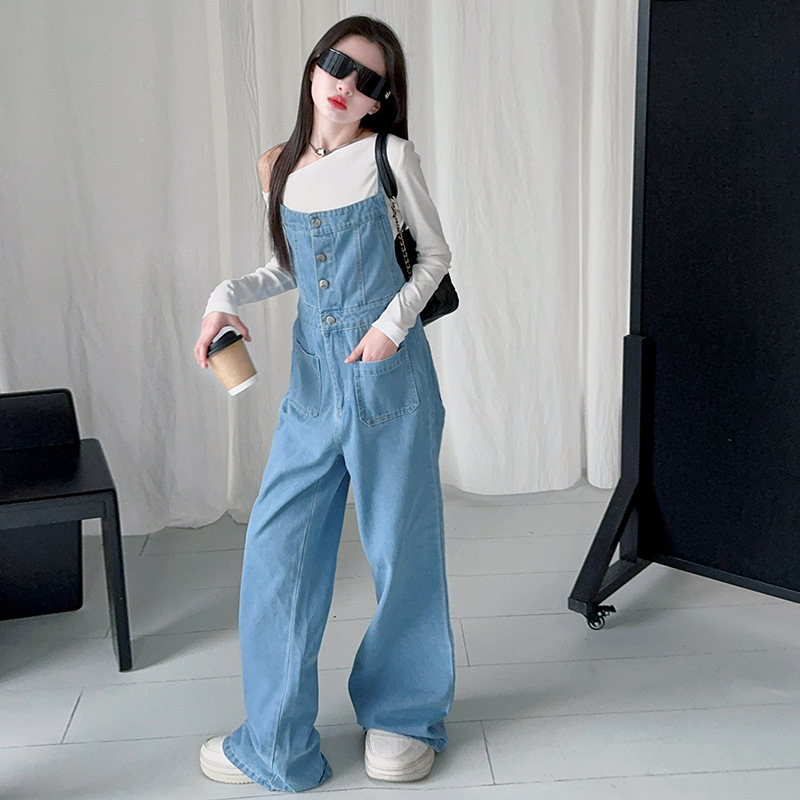 女の子のデニムの背もたれのズボンの夏の2025新型の子供のドーパミンはスーツの女の子の大きい子供のズボンを着てゆったりしています。