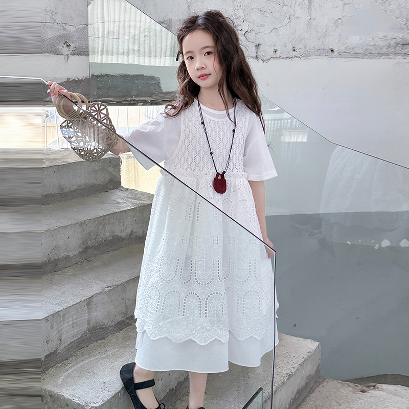 女の子のワンピース夏服2025新型の女の子の大きい子供の韓国版の洋気の透かし彫りのレースの長いスカートの白い半袖のスーツ