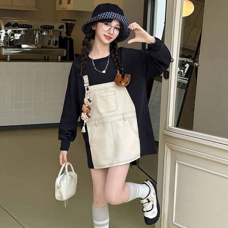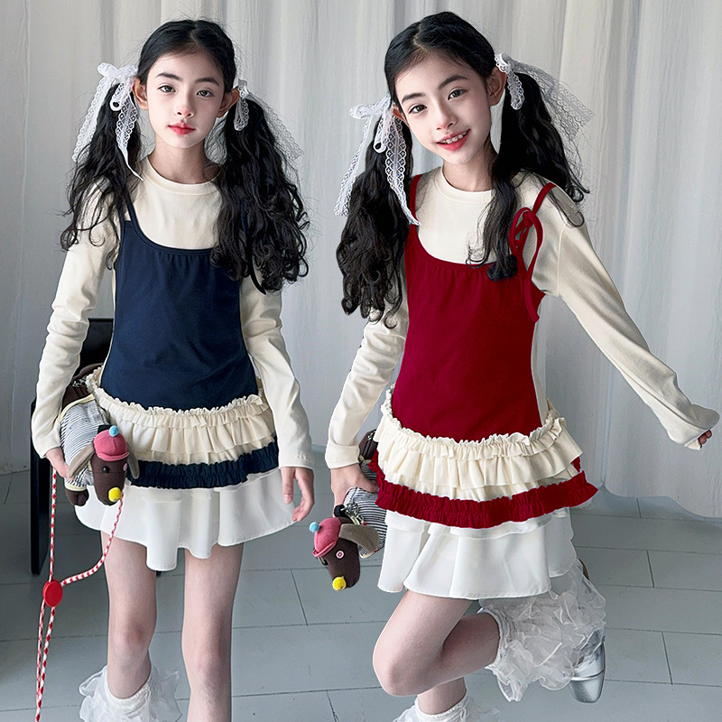 女の子のワンピース春秋2025の新型の洋気の女性の大きい子供の偽の2つのつなぎ合わせの背もたれのスカートの甘いクールな風の王女のスカート