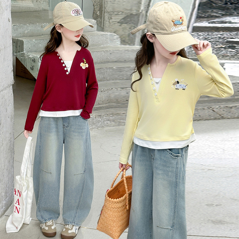 女の子の偽の2つの長袖のtシャツの広脚のジーパンのスーツの2025新型の春の洋風の底のシャツの2つのセット