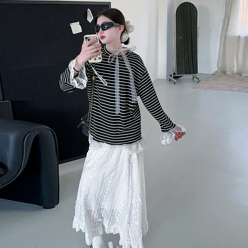 女の子のストライプの衛衣2025春の服装の子供の怠惰な風のレースの長袖のtシャツの大きい子供のフランス式の底のシャツの上着