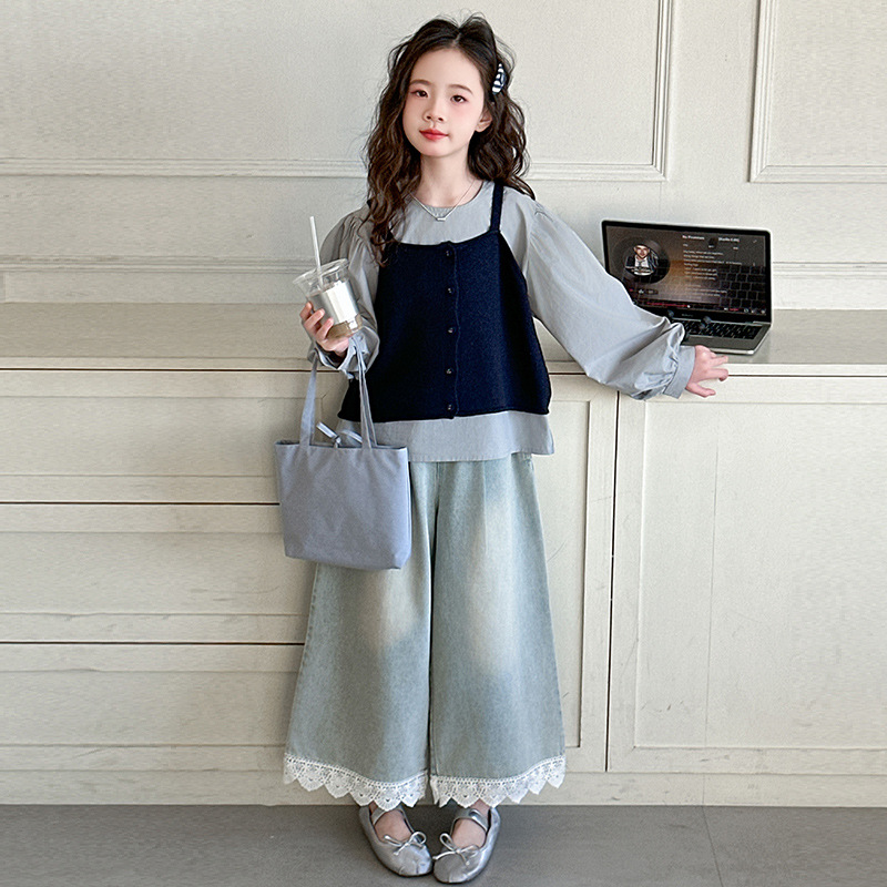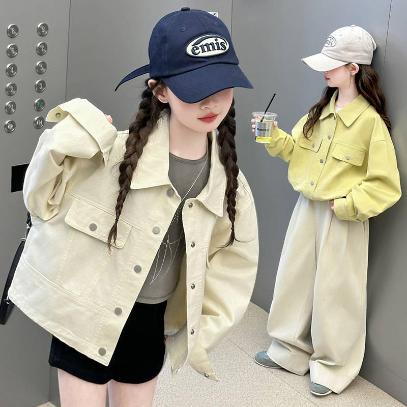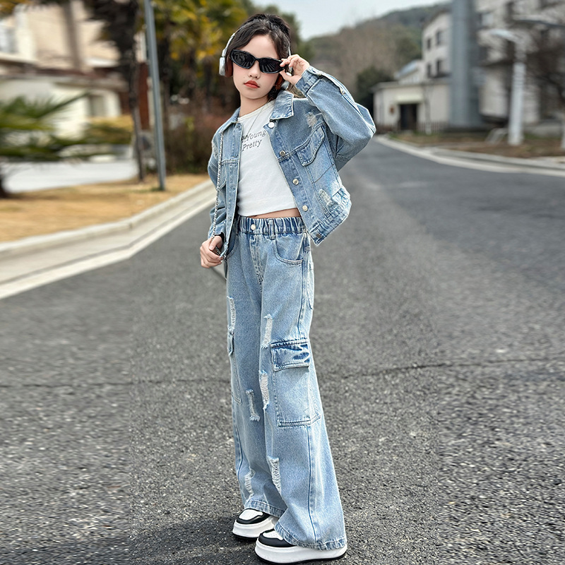 ガールズデニムスーツ2025年と秋の新型子供コート揚げ街春装破洞工装広脚ズボン2点セット