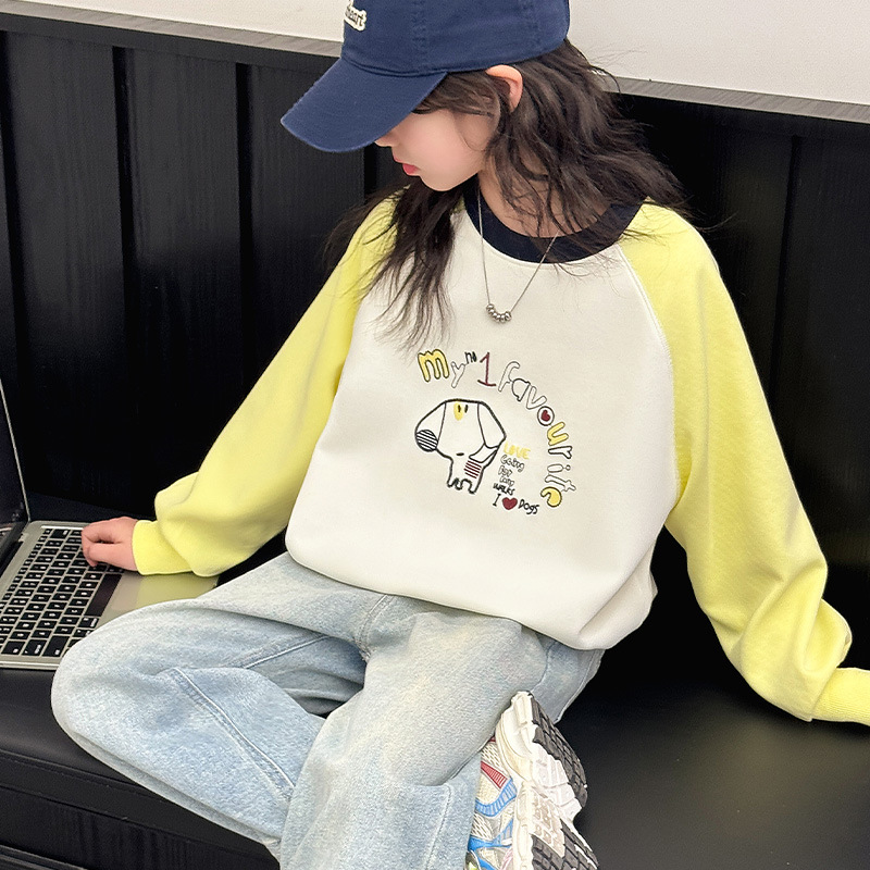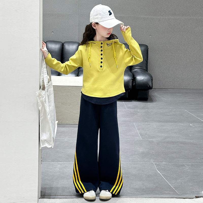 女の子の衛衣2025の新型春秋韓国版の洋気の大きい子供の頭をかぶせて色の上着の春の服装のカジュアルなズボンのスーツをつづり合わせます。