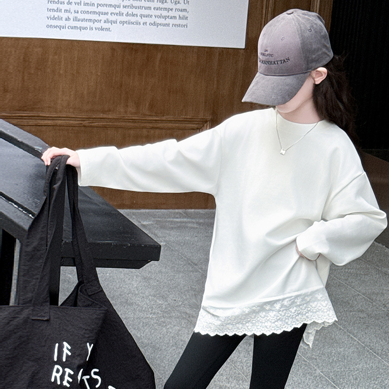 女の子のレースの底のシャツの春秋2025新型の子供の白いtシャツの長袖の女性の大きい子供の春は純色の上着を詰めます。