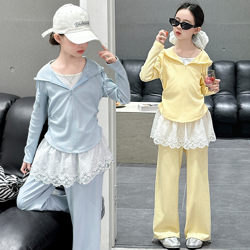 女の子春セット2025春秋新作女の子子供カジュアル春服女の子韓国版レースおならカーテン2点セット