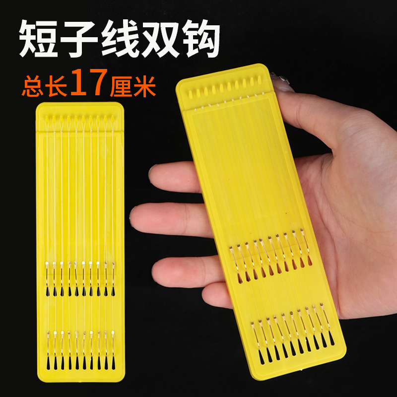 17cmの短いダブルフックの完成品の線を縛っています。