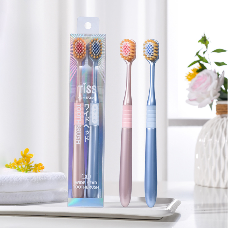 日本式の広い頭の歯ブラシの柔らかい毛の2本は成人の家庭用カップルの女性の高級な凸面の歯ブラシのメーカーの正規品の卸売りを詰めます。