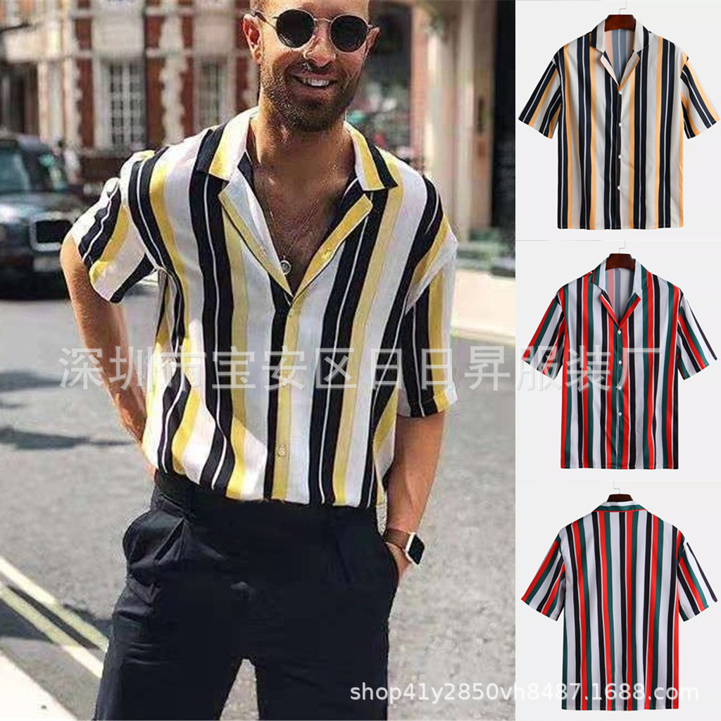 メンズクロスボーダーメンズ外国貿易欧米速売ebay新型ストライプ半袖ボタンメンズカジュアルシャツ