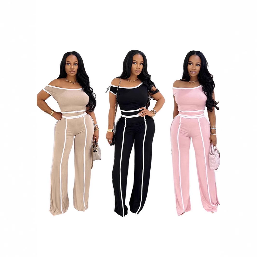 M 3079欧米のクロスボーダーの女性のギャルの2つのセットの1字の肩は色にぶつかって線の高腰のズボンのスーツの女性をつなぎます。