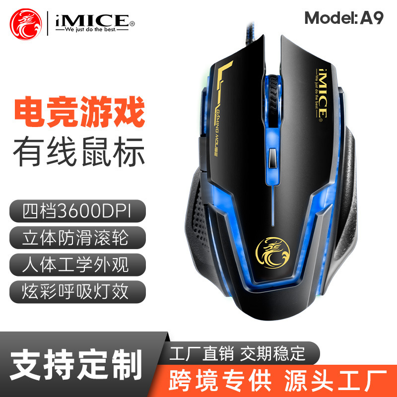 イミceメーカー直供a9有線ゲームマウスマクロ定義6ボタン四色制御呼吸灯電気競争が悪化した