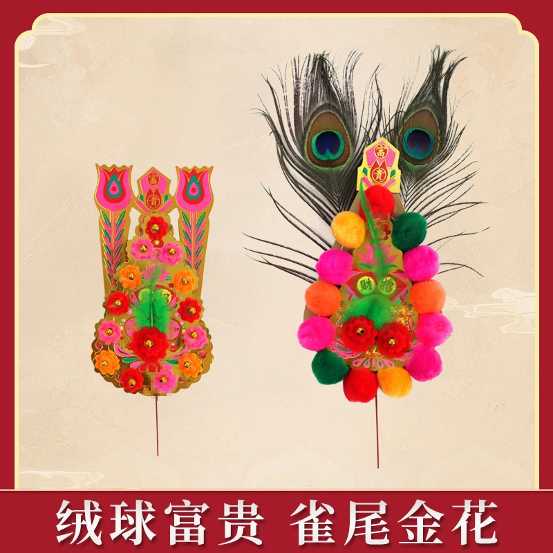 金花雀尾絨毛玉掛紅大平鳳尾拝紅仏具金花神位用品潮汕神盤神花