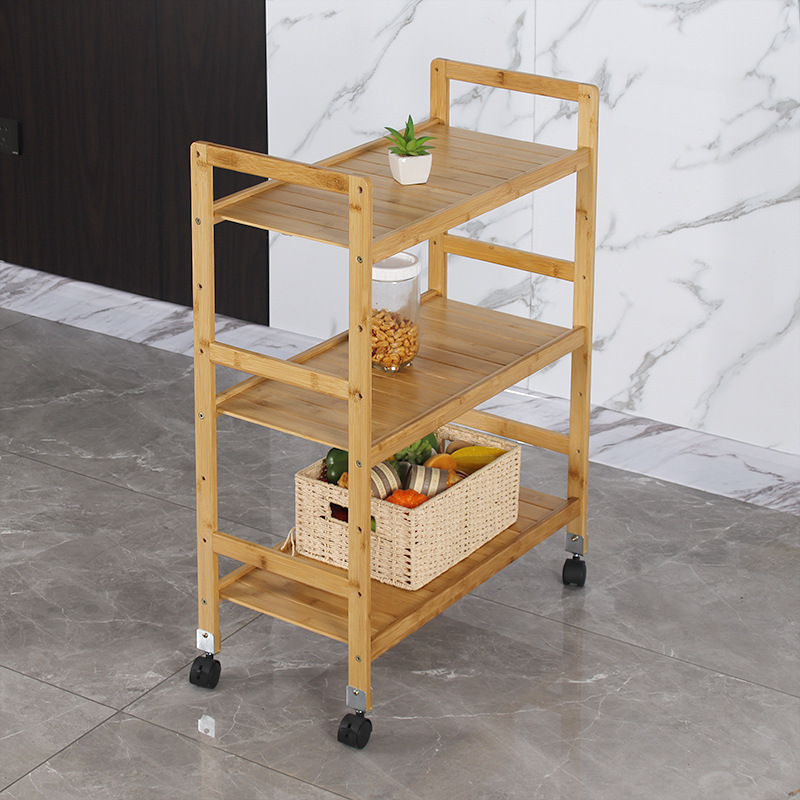 竹質の小さいワゴンの物置棚の3階の移動できる本棚の床のリビングルームの輪の多層の台所の収納棚