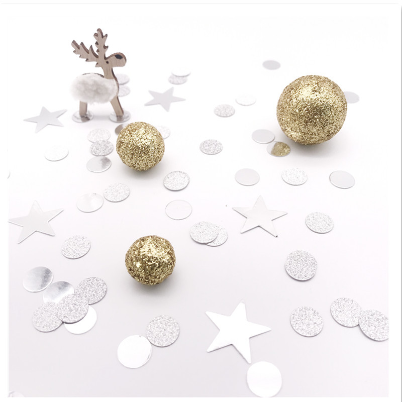 紙の銀色の円形のconfettiはデスクトップの装飾の紙片の星の紙片の部品を投げてパーティーの食事のテーブルを組み合わせます。