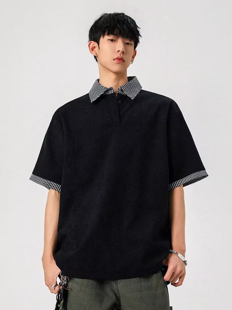 2025 アメリカンカレッジスタイルパッチワークポロシャツフェイクツーピースTシャツメンズトレンディブランドゆったり万能半袖トップス