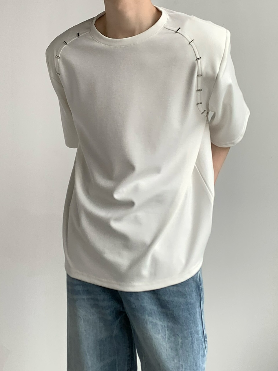 夏の韓国風ルーズヘビーウェイトショルダーパッドなし半袖Tシャツメタルデザイン半袖ボトムシャツニッチ男女兼用トレンド