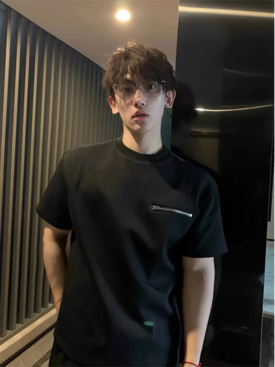 ヘビーウェイトアメリカンクリーンフィットジッパー半袖ボーイズデザインTシャツスモールネックトレンディブランドハイストリート半袖Tシャツ男性用